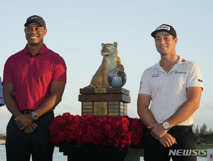 [뉴프로비던스=AP/뉴시스] 빅토르 호블란(노르웨이)이 4일(현지시간) 바하마의 뉴프로비던스 올버니 골프 클럽에서 열린 미국프로골프(PGA) 투어 이벤트 대회 '히어로 월드 챌린지' 정상에 올라 대회 주최자인 타이거 우즈(미국)와 기념 촬영을 하고 있다. 호블란은 최종합계 16언더파 272타로 이 대회 2연패를 차지했다. 2022.12.05.