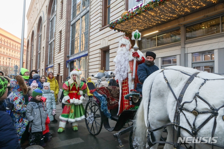 [모스크바=AP/뉴시스] 4일(현지시간) 러시아 모스크바에서 마차를 탄 데드 모로스(러시아 산타) 복장의 남성이 어린이 상점에 도착해 아이들에게 인사하고 있다. 아이들은 이 상점에 마련된 특별 우체국에서 열린 산타에게 편지 쓰는 행사에 초대받아 모여들었다. 2022.12.05.