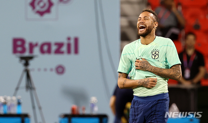 [도하(카타르)=뉴시스] 조성우 기자 = 브라질 축구대표팀 네이마르가 4일(현지시간) 오후 카타르 도하 알 아라비 SC 스타디움에서 훈련 도중 밝게 웃고 있다. 2022.12.05. [email protected]