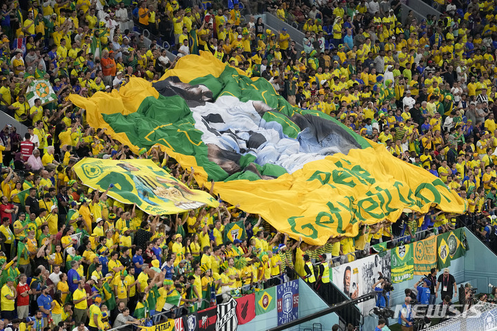 [도하=AP/뉴시스] 브라질 축구 팬들이 5일(현지시간) 카타르 도하의 974 스타디움에서 열린 브라질과 한국의 2022 카타르 월드컵 16강전을 응원하면서 입원 중인 축구 황제 펠레(82)의 쾌유를 기원하는 깃발을 펼치고 있다. 2022.12.06.