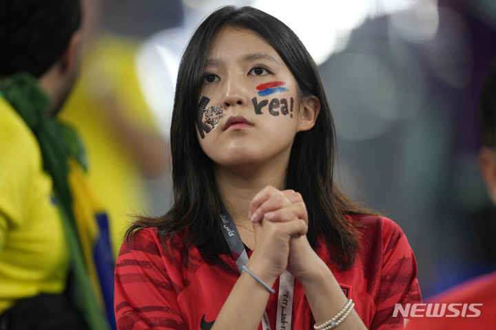 [도하=AP/뉴시스] 5일(현지시간) 카타르 도하의 스타디움 974에서 한국 축구 팬들이 한국과 브라질의 2022 카타르 월드컵 16강전 경기 시작을 기다리며 한국을 응원하고 있다. 한국은 브라질에 1-4로 패하며 월드컵 일정을 마무리했다. 2022.12.06.