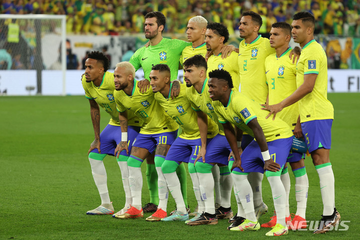 [도하(카타르)=뉴시스] 백동현 기자 = 5일(현지시간) 카타르 도하 스타디움 974에서 열린 2022 카타르 월드컵 16강전 브라질과 대한민국의 경기, 브라질 선발 출전 선수들이 기념촬영하고 있다. 2022.12.06. [email protected]