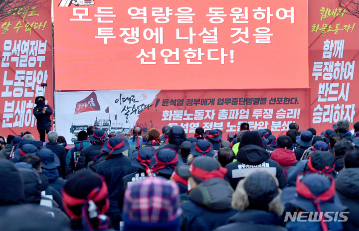 [광주=뉴시스] 김혜인 기자 = 화물연대 총파업 13일째인 6일 오후 광주 서구 치평동 국민의힘 광주시당 앞에서 민주노총 광주 노조원들이 안전운임제 확대를 촉구하는 결의대회를 열고있다. [email protected]