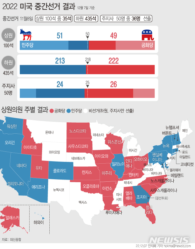[서울=뉴시스] 6일(현지시간) 미국 조지아주에서 치러진 상원의원 결선투표에서 민주당 상원의원 라파엘 워녹이 공화당 허셜 워커를 누르고 승리했다. 이로써 민주당은 상원에서 51석을 차지하며 과반 이상을 확보하게 됐다. (그래픽=안지혜 기자)