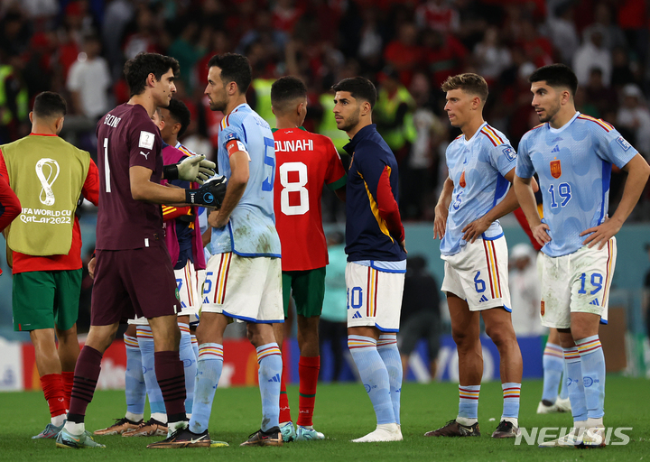 [알라이얀(카타르)=뉴시스] 조성우 기자 = 6일(현지시간) 카타르 알라이얀 에듀케이션 시티 스타디움에서 열린 2022 카타르 월드컵 16강전 모로코와 스페인의 경기, 모로코 골키퍼 야신 부누가 승부차기에서 스페인에 3-0으로 승리를 거두며 8강 진출이 확정 지은 뒤 스페인 선수들을 위로하고 있다. 2022.12.07. [email protected]