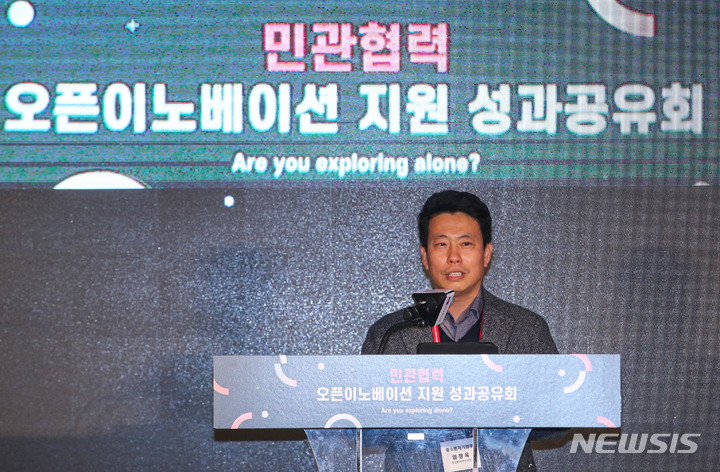 [서울=뉴시스] 권창회 기자 = 임정욱 중소벤처기업부 창업벤처혁신실장이 7일 오후 서울 중구 동대문디자인플라자에서 열린 '민관협력 오픈 이노베이션 지원 성과공유회'에서 인사말을 하고 있다. 2022.12.07. [email protected]