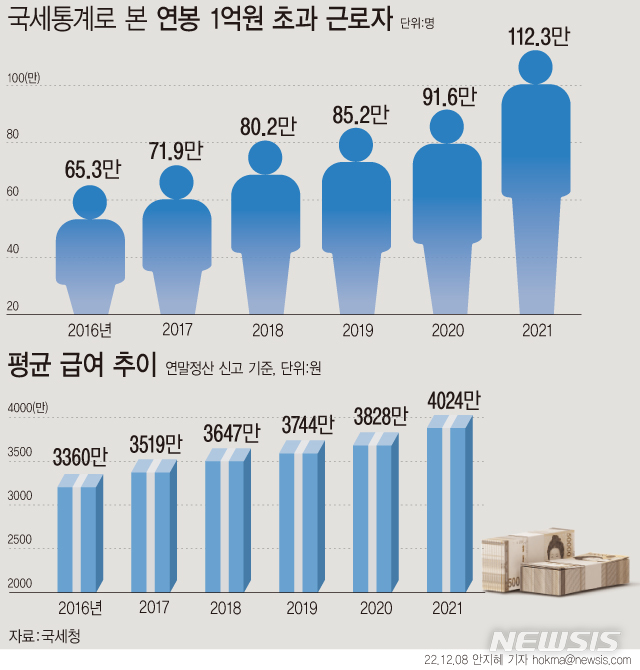 이 가운데 총급여액이 1억원을 초과하는 근로자 수는 112만3000명으로 2020년(91만6000명) 대비 22.6% 증가해 100만명을 넘었다. (그래픽=안지혜 기자)