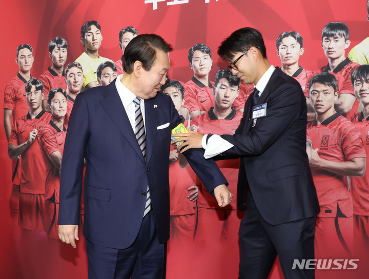 주장 손흥민 선수에게 명예 캡틴 완장 받는 윤석열 대통령