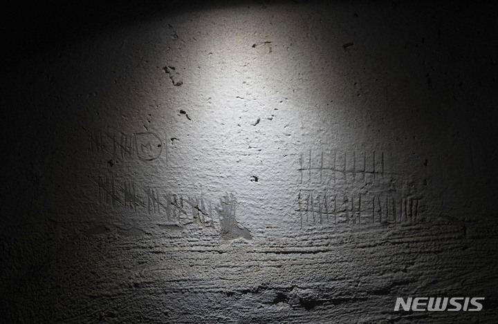 [헤르손=AP/뉴시스] 8일(현지시간) 우크라이나 헤르손에서 러시아군이 고문 장소로 사용하던 한 건물 지하실 벽에 이곳에 갇혀 있던 사람이 날짜를 기억하기 위해 긁어 놓은 자릿수 흔적이 보인다. 2022.12.09.
