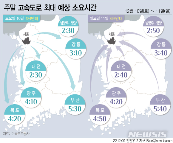 [서울=뉴시스] 한국도로공사는 12월 두 번째 주말 고속도로 교통량은 지난주와 비슷한 수준으로 쌀쌀한 날씨로 인해 평소 주말보다는 감소할 것으로 전망했다. 교통상황은 정체가 줄어드는 추세로 주요노선을 중심으로만 다소 혼잡할 것으로 예상했다. (그래픽=전진우 기자)