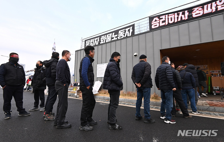 [의왕=뉴시스] 김종택 기자 = 9일 오전 경기도 의왕시 화물연대 서경지역본부에서 조합원들이 총파업 철회 여부를 결정하는 찬반 투표에 참여하고 있다. 2022.12.09. [email protected]