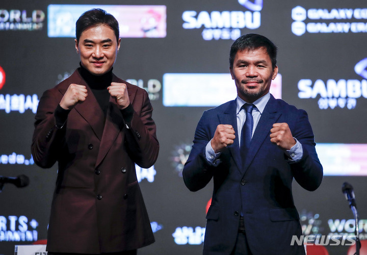 [고양=뉴시스] 정병혁 기자 = '필리핀 복싱 영웅' 매니 파퀴아오와 무술가 유대경(D.K.Yoo)이 9일 오후 경기 고양시 킨텍스에서 열린 매니 파퀴아오와 유대경의 스페셜 매치 기자회견에서 포즈를 취하고 있다. 2022.12.09. [email protected]