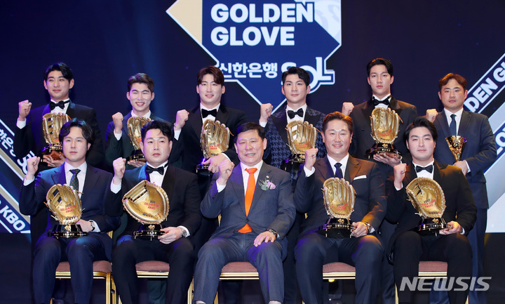 [서울=뉴시스] 김진아 기자 = 9일 서울 강남구 코엑스 오디토리움에서 열린 2022 신한은행 SOL KBO 골든글러브 시상식에서 KBO 허구연 총재가 수상자들과 기념촬영을 하고 있다. 2022 KBO 골든글러브 수상자는 투수 안우진(키움), 포수 양의지(두산), 1루수 박병호(KT) ,2루수 김혜성(키움), 3루수 최정(SSG), 유격수 오지환(LG), 외야수 이정후(키움) 피렐라(삼성) 나성범(KIA), 지명타자 이대호(롯데)다. 2022.12.09. [email protected]