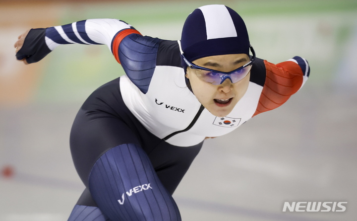 [캘거리=AP/뉴시스] 김민선(가운데)이 9일(현지시간) 캐나다 앨버타주 캘거리의 올림픽 오벌에서 열린 국제빙상경기연맹(ISU) 스피드스케이팅 월드컵 3차 대회 여자 500m 디비전A 경기를 펼치고 있다. 김민선은 36초972의 개인 최고 기록으로 금메달을 차지해 월드컵 3회 연속 우승 기록을 쓰고 있다. 2022.12.10.