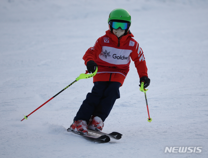 [춘천=뉴시스] 김경목 기자 = 10일 오후 어린이 스키어가 강원 춘천시 엘리시안 강촌 리조트 스키장에서 슬로프를 내려오고 있다. 2022.12.10. [email protected]