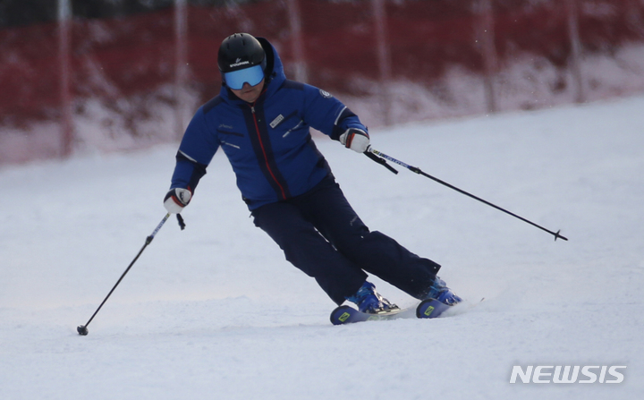 [춘천=뉴시스] 김경목 기자 = 10일 오후 스키어가 강원 춘천시 엘리시안 강촌 리조트 스키장에서 슬로프를 빠르게 내려오며 속도감을 즐기고 있다.  2022.12.10. [email protected]