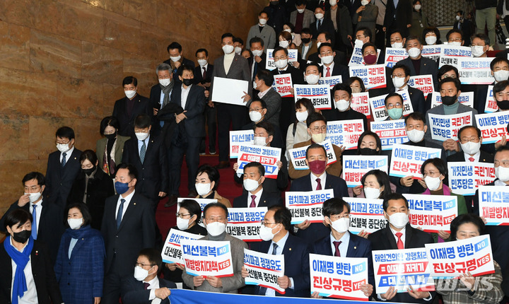 [서울=뉴시스] 추상철 기자 = 11일 오전 서울 여의도 국회 로텐더홀 앞에서 이상민 행정안전부 장관 해임건의안 강행처리를 규탄하며 피켓시위를 하는 국민의힘 의원들 옆으로 해임건의안 투표를 마친 더불어민주당 의원들이 지나고 있다. (공동취재사진) 2022.12.11. [email protected]