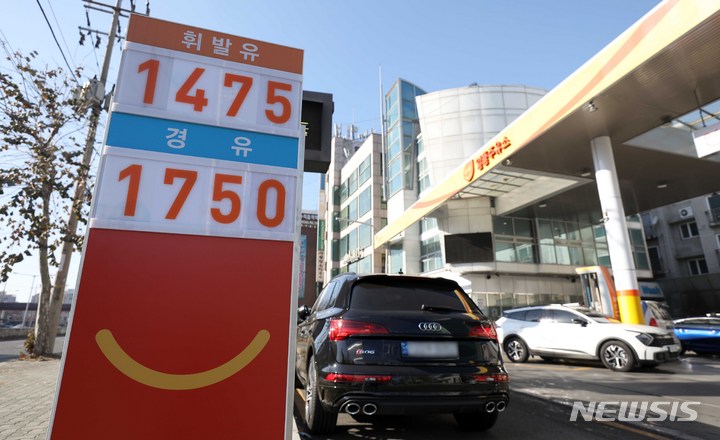 [서울=뉴시스] 김선웅 기자 = 11일 서울 강서구 화곡동 목화주유소에서 휘발유와 경유가 판매되고 있다. 한국석유공사에 따르면 전날 전국 휘발유 평균 판매가격은 리터당 1595.42원으로 1500원대를 기록한 것은 17개월만이다. 2022.12.11. [email protected]