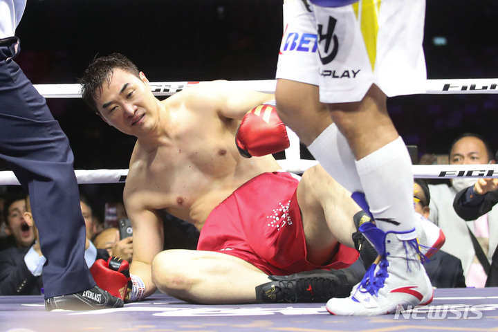 [고양=뉴시스] 권창회 기자 =11일 경기 고양시 일산 킨텍스에서 필리핀 복싱 영웅 매니 파퀴아오와 한국 출신 무술가 유대경의 스페셜 매치에서 유대경이 파퀴아오의 펀치에 맞아 쓰러져 있다. 2022.12.11. [email protected]