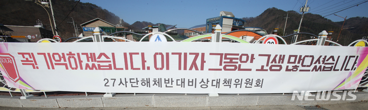 [화천=뉴시스] 김경목 기자 = 인구 감소에 따른 병력 감축 문제 해결을 위해 국방부가 진행하는 국방개혁 2.0 정책에 따라 강원도 화천군 사내면에 주둔했던 육군 제27보병사단(이기자부대)이 지난 11월30일 공식 해체됐다. 1953년 9월18일 강원도 양양군에서 부대를 창설한 지 69년 만이다. 11일 27사단 해체를 반대했던 주민 단체가 내건 현수막이 화천군 화천읍에 걸려 있다. 2022.12.11. [email protected]