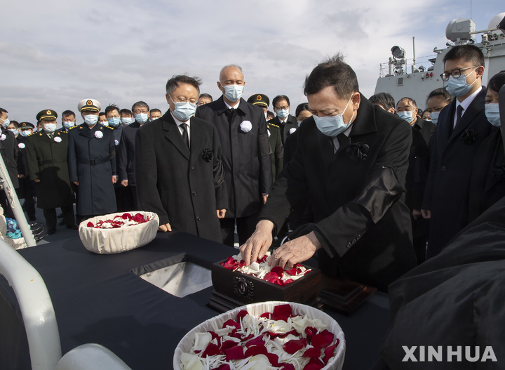 [상하이=신화/뉴시스] 장쩌민 전 중국 국가주석의 유해가 11일(현지시간) 중국 상하이 창장(양쯔강) 하구 바다에 뿌려지고 있다. 장 전 주석의 유해는 본인과 가족의 뜻에 따라 바다에 뿌려졌으며 이 자리에는 차이치 중국 공산당 중앙 정치국 상무위원과 장 전 주석의 부인 왕예핑 등 유가족이 참석했다. 2022.12.12.