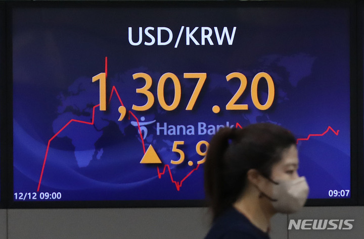 [서울=뉴시스] 조수정 기자 = 12일 서울 외환시장에서 원·달러 환율이 전 거래일(1301.3원)보다 4.5원 오른 1305.8원에 거래를 시작했다. 12일 오전 서울 중구 하나은행 딜링룸 전광판에 환율이 표시되고 있다. 2022.12.12. [email protected]