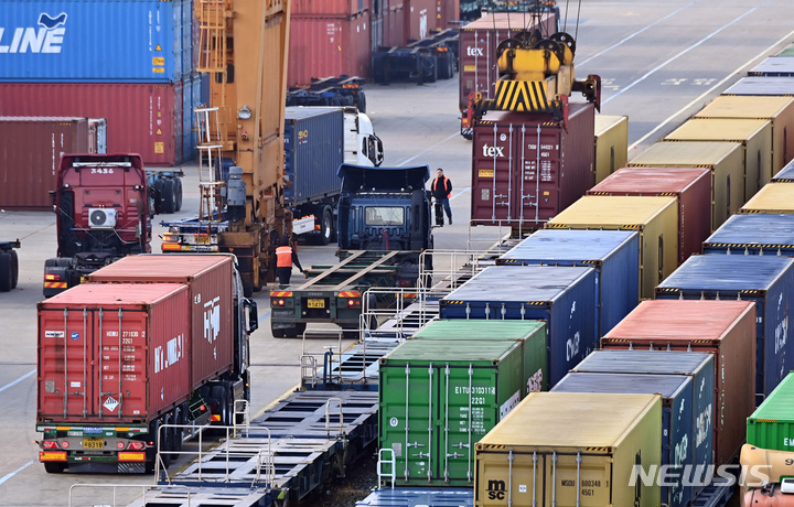 [의왕=뉴시스] 김종택 기자 = 화물연대의 총파업 철회로 물류운송이 재개된 12일 경기도 의왕시 내륙컨테이너기지(ICD)에서 화물차가 분주하게 이동하고 있다. 2022.12.12. [email protected]