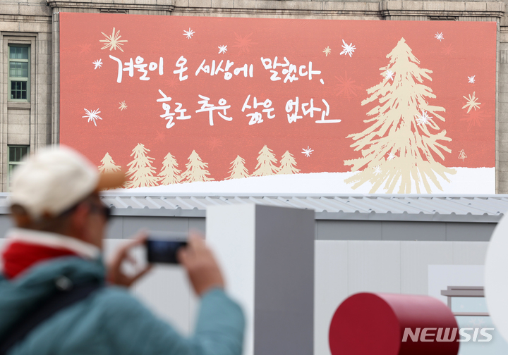 [서울=뉴시스] 조성우 기자 = 12일 오전 서울 중구 서울도서관 외벽에 새단장한 서울꿈새김판에 '겨울이 온 세상에 말했다, 홀로 추운 삶은 없다고' 문구가 적혀 있다. 2022.12.12. [email protected]