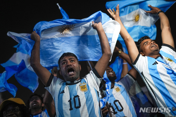 [루사일=AP/뉴시스] 아르헨티나 응원단이 13일(현지시간) 카타르 루사일 스타디움에서 아르헨티나가 2022 카타르 월드컵 준결승 크로아티아를 물리치고 결승에 진출하자 환호하고 있다. 아르헨티나는 크로아티아를 3-0으로 꺾고 8년 만에 결승에 올랐다. 2022.12.14.
