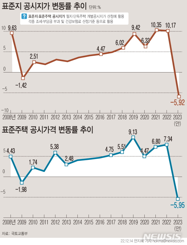 [서울=뉴시스] 국토교통부가 14일 발표한 '2023년 표준지·표준주택 공시가격(안)'에 따르면 표준지 공시지가는 2022년 대비 5.92% 하락한 것으로 나타났다. 전국 표준주택 2023년도 공시가격 변동률은 -5.95%를 기록했다. (그래픽=안지혜 기자)