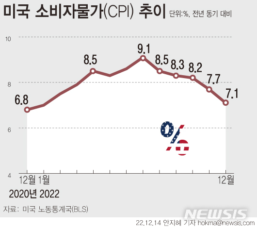 [서울=뉴시스] 13일(현지 시간) 미국 노동통계국에 따르면 11월 미국 소비자물가상승률이 전년 동월 대비 7.1% 상승했다. 작년 12월(7.0%) 이후 최저치로 시장 전망치보다도 낮은 수준이다. (그래픽=안지혜 기자)