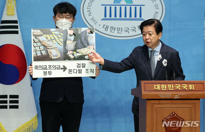 [서울=뉴시스] 고범준 기자 = 뇌물수수, 정치자금법 위반 등 혐의로 구속영장이 청구된 노웅래 더불어민주당 의원이 14일 오전 서울 여의도 국회 소통관에서 기자회견을 하고 있다. 노 의원은 검찰이 발견한 돈은 축의금과 조의금 이라고 발언했다. 2022.12.14. [email protected]