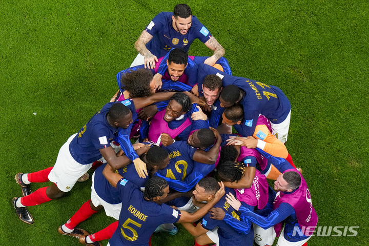 [알코르=AP/뉴시스] 프랑스의 랜달 콜로 무아니(가운데)가 14일(현지시간) 카타르 알코르의 알바이트 스타디움에서 열린 2022 카타르 월드컵 모로코와의 준결승 후반 34분 추가 골을 넣고 동료들과 기쁨을 나누고 있다. 2연패를 노리는 프랑스는 테오 에르난데스의 선제골과 무아니의 골을 묶어 모로코를 2-0으로 꺾고 결승에 올라 아르헨티나와 우승을 다툰다. 2022.12.15.