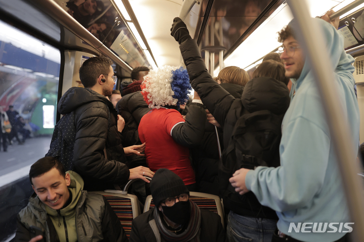 [파리=AP/뉴시스] 14일(현지시간) 프랑스 파리의 지하철 안에서 시민들이 프랑스 축구 대표팀의 2022 카타르 월드컵 모로코와의 준결승 승리에 환호하고 있다. 2연패를 노리는 프랑스는 모로코를 2-0으로 꺾고 결승에 올라 아르헨티나와 우승을 다툰다. 2022.12.15.