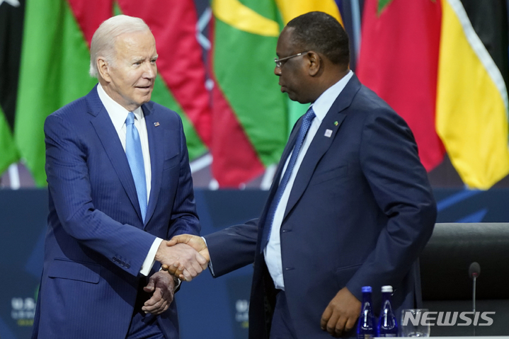 [워싱턴=AP/뉴시스] 조 바이든 미국 대통령이 15일(현지시간) 워싱턴에서 열린 아프리카연합(AU)의 어젠다 2063에 관한 미국-아프리카 정상 회담에 도착해 마키 살 세네갈 대통령과 악수하고 있다. 바이든 대통령은 아프리카 국가에 72조 원 규모의 투자 계획을 발표했다. 2022.12.16.