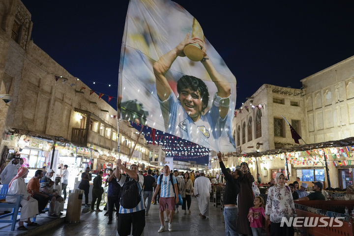 [도하=AP/뉴시스] 15일(현지시간) 카타르 도하의 전통시장 수크 와키프에서 한 아르헨티나 축구 팬이 디에고 마라도나의 사진이 있는 깃발을 흔들며 자국팀을 응원하고 있다. 아르헨티나는 오는 18일 프랑스와 2022 카타르 월드컵 대망의 결승전을 앞두고 있다. 2022.12.16.