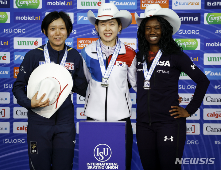 [캘거리=AP/뉴시스] 김민선(가운데)이 16일(현지시간) 캐나다 캘거리의 올림픽 오벌에서 열린 2022-23 국제빙상경기연맹(ISU) 스피드스케이팅 월드컵 4차 대회 여자 500m 디비전A 정상에 올라 금메달을 목에 걸고 기념 촬영을 하고 있다. 김민선은 36초96으로 개인 기록을 경신하며 월드컵 4회 연속 우승을 차지했다. 2022.12.17.