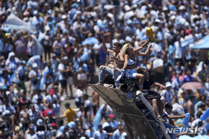 [부에노스아이레스=AP/뉴시스] 20일(현지시간) 아르헨티나 부에노스아이레스 축구 팬들이 무개 버스를 타고 퍼레이드를 펼치는 아르헨티나 축구대표팀을 환영하고 있다. 아르헨티나 정부는 36년 만의 월드컵 우승을 기념해 축구대표팀이 귀국한 20일을 공휴일로 지정했다. 2022.12.21.