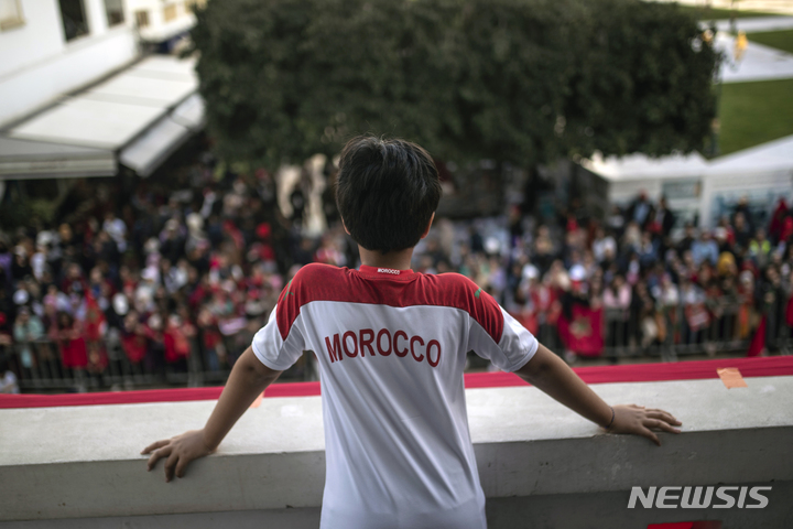 [라바트=AP/뉴시스] 20일(현지시간) 모로코 수도 라바트 시내의 건물 발코니에서 한 소년이 모로코 축구대표팀의 귀국 퍼레이드를 지켜보고 있다. 2022 카타르 월드컵에서 아프리카 돌풍을 일으켰던 모로코는 4위를 차지하고 금의환향했다. 2022.12.21.