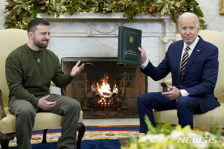 [워싱턴=AP/뉴시스] 조 바이든(오른쪽) 미국 대통령이 21일(현지시간) 백악관 집무실에서 볼로디미르 젤렌스키 우크라이나 대통령으로부터 받은 선물을 들고 있다. 미국 정부는 젤렌스키 대통령 방미에 맞춰 패트리엇 방공미사일 시스템 등 18억5000만 달러(약 2조3000억 원) 규모의 추가 무기 지원을 발표했다. 2022.12.22.