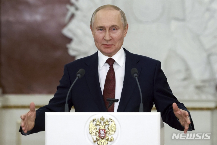 [모스크바=AP/뉴시스] 블라디미르 푸틴 러시아 대통령이 22일(현지시간) 모스크바 크렘린궁에서 열린 청년정책에 관한 국무위원회를 마치고 기자회견하고 있다. 푸틴 대통령은 "러시아는 우크라이나와 협상을 거부하지 않았다, 우크라이나 지도부가 거부했다"라며 "우리 목표는 이 전쟁을 끝내는 것"이라고 말했다. 2022.12.23.
