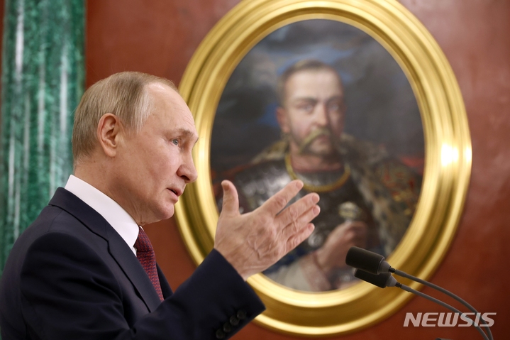 [모스크바=AP/뉴시스] 블라디미르 푸틴 러시아 대통령이 22일(현지시간) 모스크바 크렘린궁에서 열린 청년정책에 관한 국무위원회를 마치고 기자회견하고 있다. 푸틴 대통령은 "러시아는 우크라이나와 협상을 거부하지 않았다, 우크라이나 지도부가 거부했다"라며 "우리 목표는 이 전쟁을 끝내는 것"이라고 말했다. 2022.12.23.