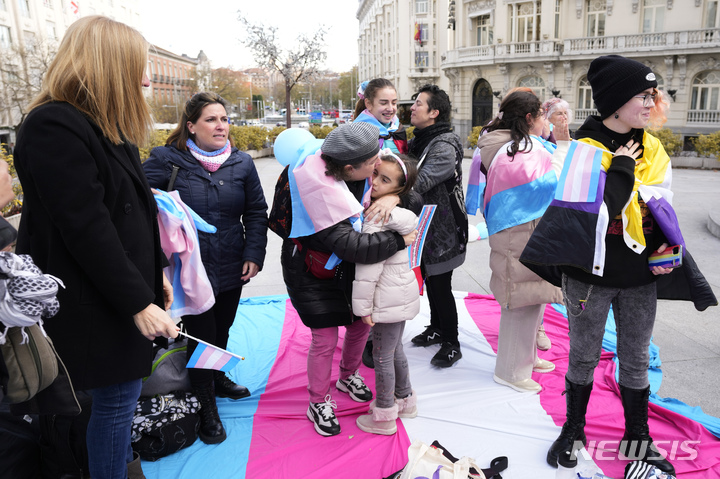 [마드리드=AP/뉴시스] 22일(현지시간) 스페인 마드리드 의회 밖에 모인 사람들이 성별을 자유롭게 바꾸게 해주는 트랜스젠더 법 발표에 기뻐하고 있다. 스페인 하원은 16세 이상의 시민이 의료 감독 없이 등록된 성별을 바꿀 수 있도록 하는 성전환 법을 통과시켰다. 이에 따라 12~13세 미성년자는 성별 변경을 위해 판사의 허가가 필요하고 14~16세 사이의 미성년자는 부모나 법률 대리인과 동행해야 한다. 2022.12.23.