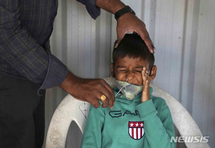 [하이데라바드=AP/뉴시스] 28일(현지시간) 인도 하이데라바드의 국립 발열전담 병원에서 한 소년이 코로나19 검사를 하고 있다. 중국이 방역을 위한 입국 제한 조치를 해제하면서 중국발 여행객이 급증할 조짐을 보이자 인도는 중국발 입국자들의 코로나19 검사를 의무화하기로 했다. 2022.12.28.