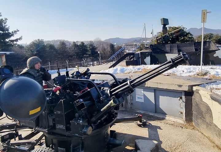[서울=뉴시스] 김승겸 합동참모본부 의장 주관으로 29일 경기 양평군에서 적 소형무인기 대응 및 격멸훈련이 실시된 가운데, 육군 제5군단 장병들이 방공 무기체계인 20mm발칸을 운용하고 있다. (사진=합동참모본부 제공) 2022.12.29. [email protected] *재판매 및 DB 금지