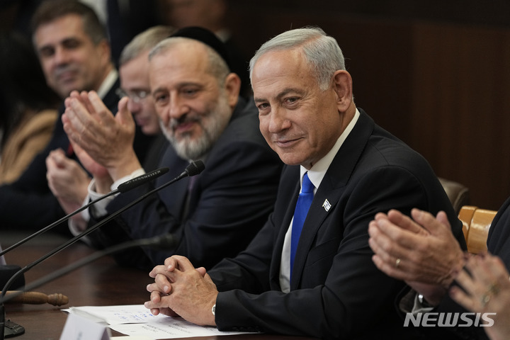 [예루살렘=AP/뉴시스] 베냐민 네타냐후 이스라엘 신임 총리가 29일(현지시간) 예루살렘에서 열린 각료회의에 참석해 각료들로부터 박수받고 있다. 이스라엘 의회 ‘크네세트’가 이날 네타냐후의 우파 연정을 승인하면서 이스라엘 역사상 가장 극우 정부라고 평가를 받는 네타냐후 총리의 연립정부가 공식 출범했다. 2022.12.30.