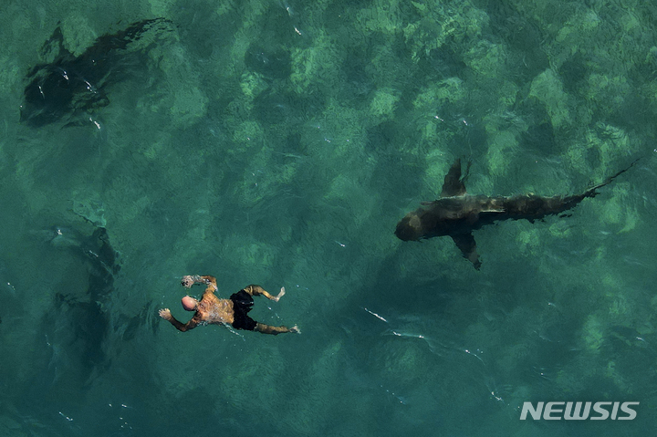 [하데라=AP/뉴시스] 흉상어들이 30일(현지시간) 이스라엘 하데라 해안 발전소 인근 지중해에서 수영하는 스노클러 주변을 어슬렁거리고 있다. 하데라의 공장지대에서 방출되는 뜨거운 물은 흉상어를 끌어모으는데 이로 인한 남획으로 흉상어는 멸종위기를 맞고 있다. 2022.12.30.