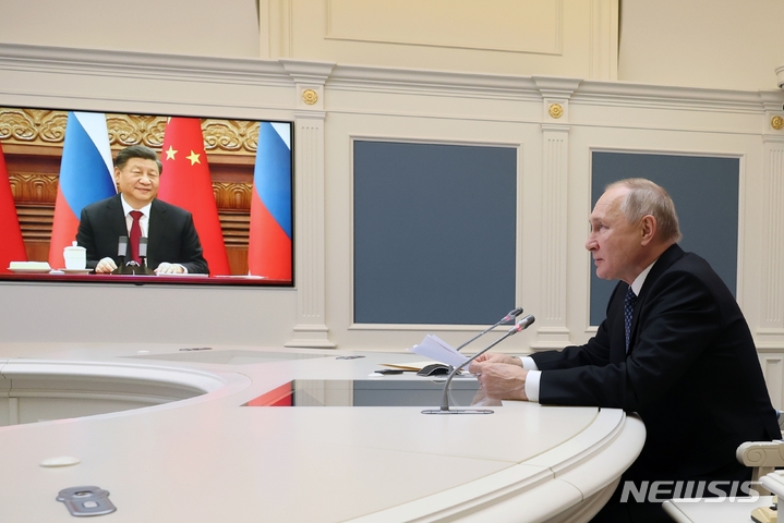 [모스크바=AP/뉴시스] 블라디미르 푸틴 러시아 대통령이 30일(현지시간) 모스크바 크렘린궁에서 시진핑 중국 국가주석과 화상 정상회담을 하고 있다. 푸틴 대통령은 "중-러 관계에 군사 협력은 '특별한 위치'에 있다"라며 시 주석을 내년 봄 모스크바로 초청했고 시 주석은 "중국 국민의 이익과 전 세계의 안정을 위해 글로벌 파트너가 될 준비가 돼 있다"라고 말했다. 2022.12.31.