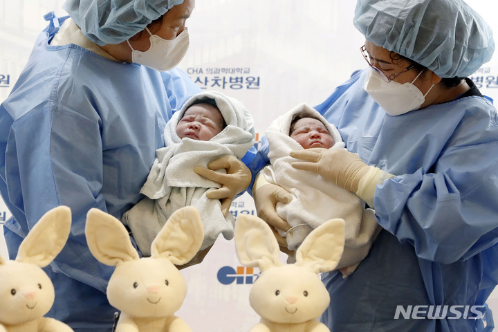 [고양=뉴시스] 최동준 기자 = 2023년 새해 첫 아기가 1일 0시경 경기 고양시 일산 차병원에서 태어났다. 엄마 김현정 씨(40세), 아빠 장동규 씨(42) 사이에서 태어난 쌍둥이 여아 짱순이(태명, 왼쪽, 3.09kg), 남아 짱짱이(태명, 3,32kg)가 친할머니 정윤자(왼쪽) 씨, 외할머니 문상순 씨 품에 안겨 있다. 2023.01.01. [email protected]