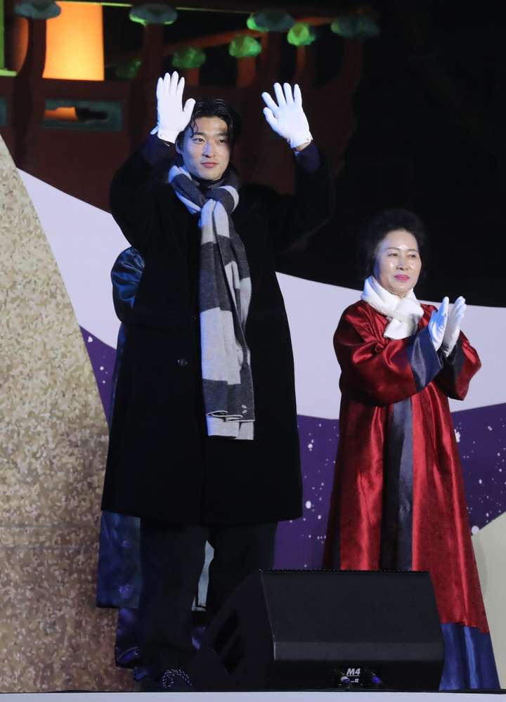 [서울=뉴시스] 백동현 기자 = 2022년 마지막 날인 31일 오후 서울 종로구 보신각에서 축구선수 조규성이 제야의 종 타종행사에 앞서 시민들에게 인사하고 있다. (공동취재사진) 2022.12.31. [email protected]
